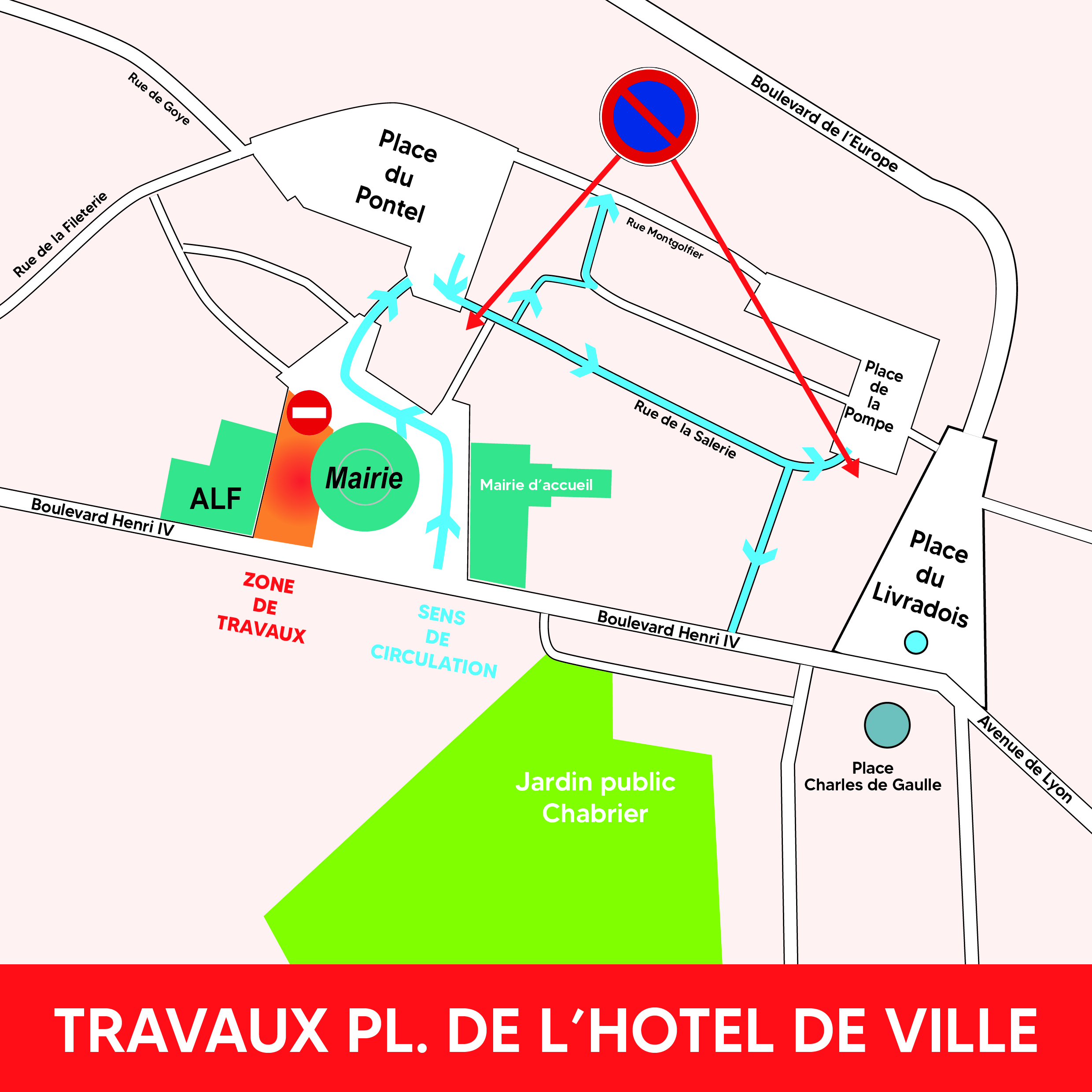 La circulation dans le centre-ville sera maintenue pendant toute la durée des travaux. L’accès à la place du Pontel restera possible depuis la place de l’Hôtel de Ville, seule la moitié basse du giratoire étant neutralisée.